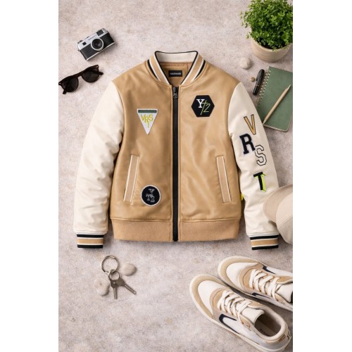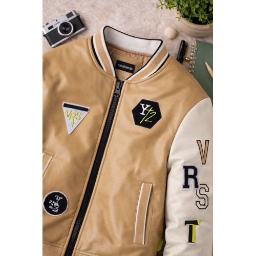 Realizată din piele ecologică de înaltă calitate, geaca oferă un aspect elegant și o bună rezistență în timp. Modelul este decorat cu aplicații și patch-uri specifice stilului varsity, care accentuează caracterul urban și dinamic al produsului. Mânecile contrastante și detaliile atent lucrate completează designul modern.