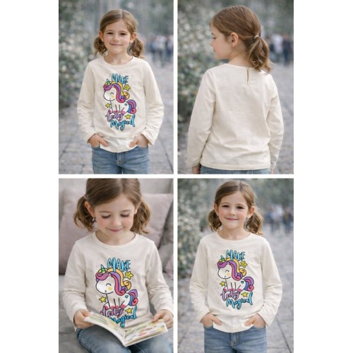 Modelul este de culoare uni, ușor de asortat, și este decorat cu un imprimeu vesel cu unicorn, care adaugă un plus de culoare și personalitate ținutelor copilului. Bluza se închide discret la spate cu nasture, facilitând îmbrăcarea și oferind un plus de funcționalitate.
