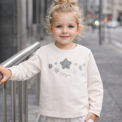Bluza pentru fete Sarabanda este confecționată din jerseu de bumbac elastic, oferind confort ridicat, elasticitate și o senzație plăcută la purtare. Materialul este moale și delicat cu pielea, fiind potrivit pentru utilizarea zilnică sau pentru ocazii speciale.