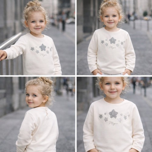Partea frontală este decorată cu aplicații în formă de steluțe, realizate din ștrasuri strălucitoare, care adaugă un plus de rafinament și un aspect elegant. Designul simplu și culorile delicate permit asortarea ușoară cu pantaloni, fuste sau colanți.