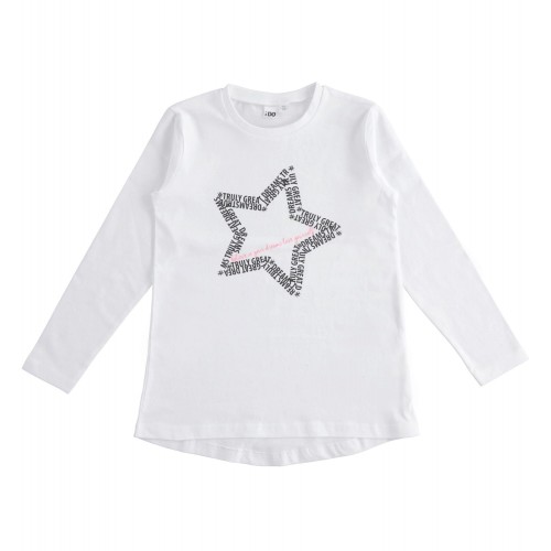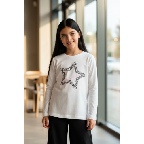 Modelul prezintă un imprimeu frontal în formă de stea, completat de aplicații delicate cu strasuri, care adaugă o notă discretă de eleganță și strălucire. Croiala ușor cambrată și tivul lejer rotunjit conferă un aspect feminin și rafinat.