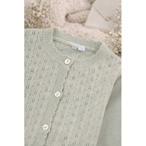 Designul uni este îmbogățit cu un model brodat cu perforații, care adaugă un aer rafinat și feminin cardiganului. Închiderea frontală cu nasturi permite o îmbrăcare ușoară și practică, iar croiala clasică îl face ușor de asortat cu rochii, fuste sau pantaloni.