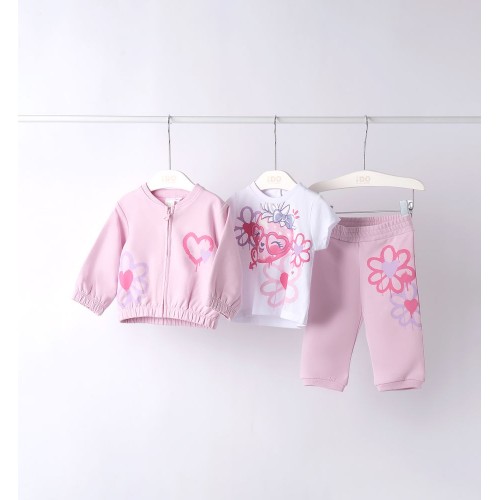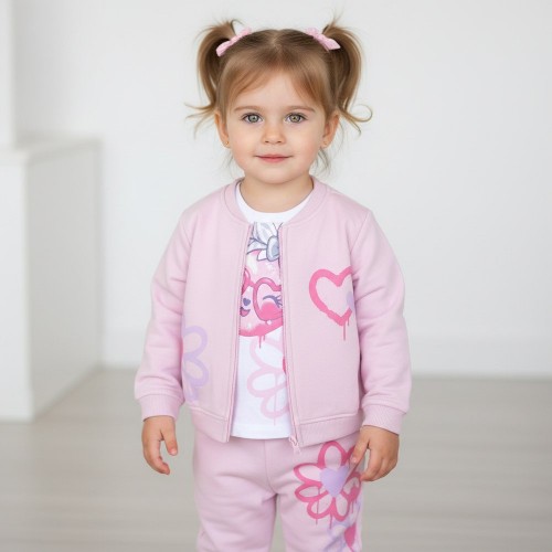 Compleul de 3 piese pentru bebe fete I Do este alegerea perfectă pentru un look complet, confortabil și jucăuș. Setul este realizat în nuanțe de roz pastel, cu imprimeuri vesele cu inimi și flori, ideale pentru garderoba de zi cu zi a micuței tale.