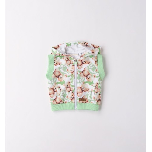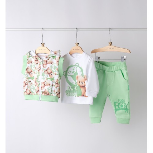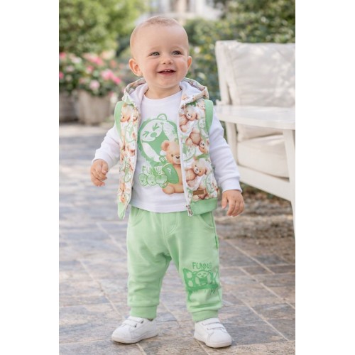 Setul este compus din trei piese: vestă cu glugă, bluză cu mânecă lungă și pantaloni sport, toate armonios asortate și decorate cu imprimeuri vesele cu ursuleți. Vesta cu glugă adaugă un plus de căldură și un aspect jucăuș, fiind ideală pentru completarea ținutelor de zi cu zi.