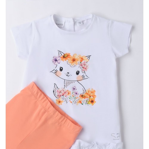 Setul este format dintr-un tricou alb cu imprimeu floral adorabil, reprezentând o pisicuță cu flori colorate, decorat cu volănaș la tiv și aplicații discrete cu strasuri ce adaugă o notă elegantă. Tricoul are închidere la spate cu nasture, pentru îmbrăcare rapidă și confortabilă.
