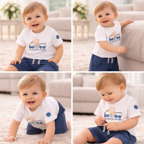 Tricoul se remarcă printr-un design simpatic, cu trenuleț brodat pe față și mesajul „Un carico di coccole”, perfect pentru micii exploratori. Materialul din bumbac elastic este moale, plăcut la atingere și delicat cu pielea sensibilă a copiilor. Închiderea cu capse la spate sau pe umăr (în funcție de model) permite o îmbrăcare rapidă și ușoară.