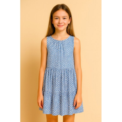 Rochia iDO pentru fete este realizată din material 100% vâscoză, ușor și fluid, perfect pentru zilele călduroase de vară. Modelul este fără mâneci și are un imprimeu geometric albastru pe fond alb, care oferă un aspect modern și rafinat.