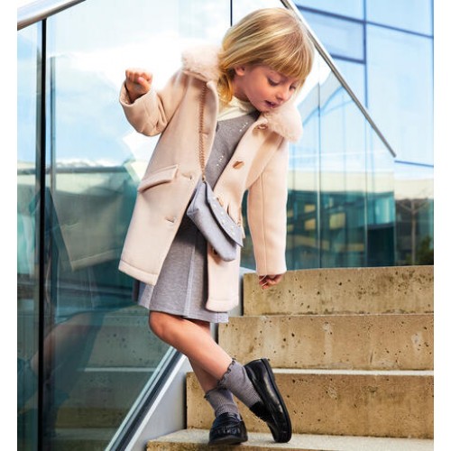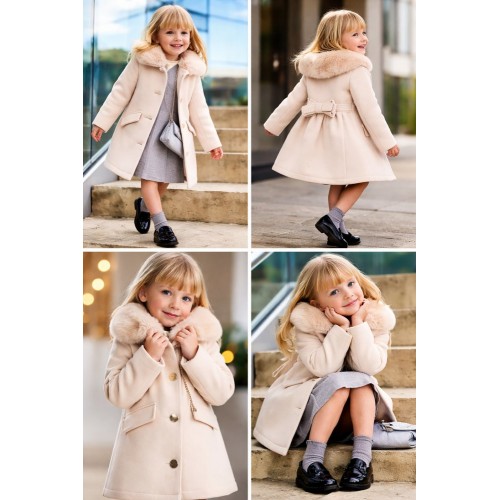 Gulerul detașabil, realizat din material cald și foarte moale, adaugă un plus de eleganță și poate fi îndepărtat pentru un look mai simplu. Paltonul este prevăzut cu închidere frontală cu nasturi și este decorat cu o fundă delicată la spate, detaliu care completează designul feminin. Potrivit pentru fete cu vârste cuprinse între 9 luni și 8 ani, este ideal atât pentru purtarea zilnică, cât și pentru ocazii speciale.