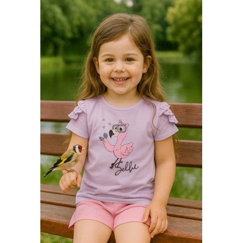 Tricoul are mânecă scurtă și gât rotund, fiind decorat pe partea frontală cu un imprimeu simpatic cu flamingo și inscripția „Selfie”. Umerii sunt accentuați cu volane, care adaugă un plus de feminitate și stil.