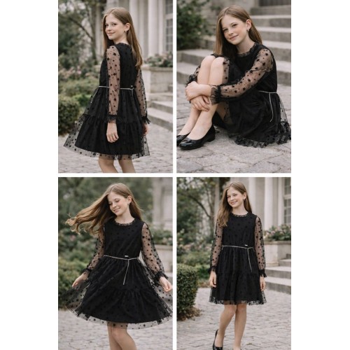 Rochia elegantă Sarabanda pentru fete este o piesă rafinată, creată pentru a oferi un look deosebit la evenimente speciale. Confecționată din tull fin brodat cu stele, rochia impresionează prin designul său sofisticat și aerul delicat, perfect pentru ținutele festive.