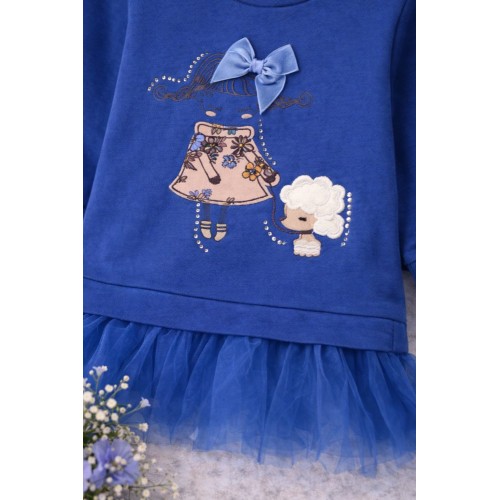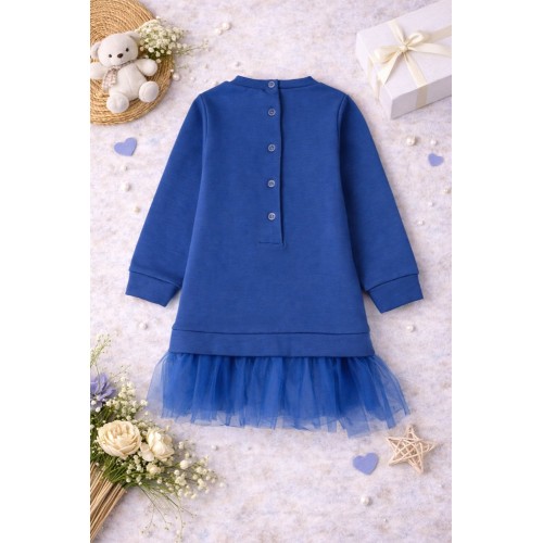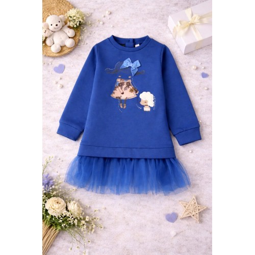 Designul este îmbogățit cu volane din tull în partea inferioară, care adaugă un efect elegant și jucăuș, transformând rochia într-o alegere ideală atât pentru joacă, cât și pentru evenimente festive. Fundița decorativă din catifea și imprimeul frontal cu detalii fine oferă un plus de rafinament și personalitate.
