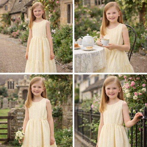 Modelul este fără mâneci, oferind lejeritate și confort în zilele calde. Rochia este prevăzută cu căptușeală din bumbac, pentru o purtare plăcută și protecție suplimentară pentru pielea sensibilă a copiilor. Deschiderea laterală în talie adaugă un detaliu discret și funcțional, iar închiderea la spate cu fermoar invizibil asigură o îmbrăcare ușoară și un aspect elegant.