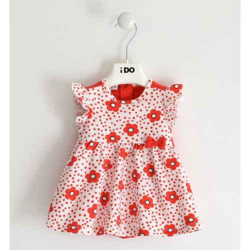 Rochiță Tip Salopetă iDO Bebe Fetiță din Bumbac Elastic cu Imprimeu Floral Roșu și Fundiță Decorativă, 4.4650PV22ROS