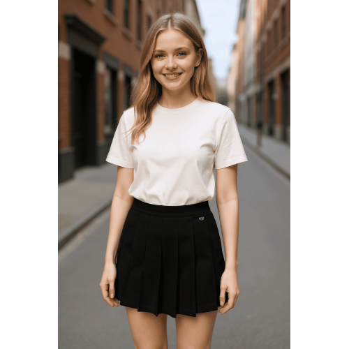 Designul inovator de tip skort combină eleganța unei fuste cu practicitatea pantalonilor scurți, fiind o alegere ideală pentru fete active și stilate.