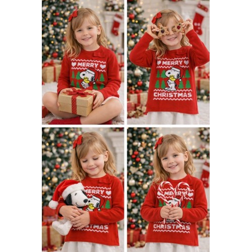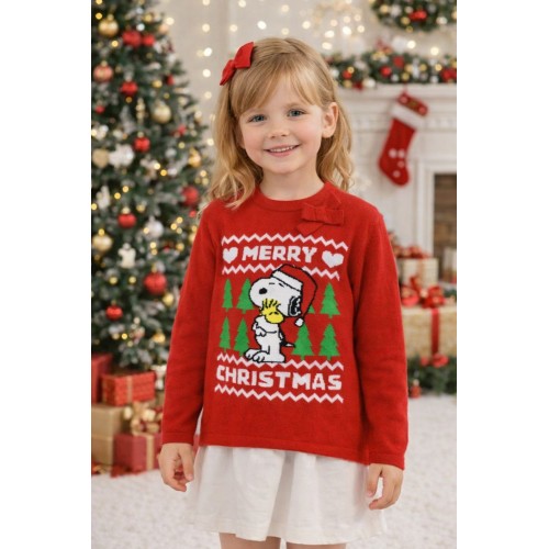 Pulover Crăciun Fetițe Sarabanda Roșu cu Snoopy, Mânecă Lungă, Bumbac și Lână, 0.5247TI22RO