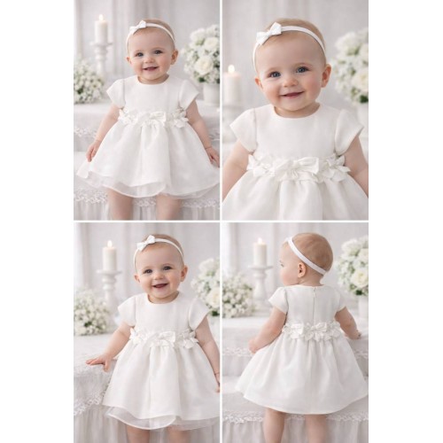 Modelul este prevăzut cu deschidere la spate cu fermoar invizibil, care facilitează îmbrăcarea, iar căptușeala din bumbac asigură o purtare plăcută pe durata întregii ceremonii. Detaliile decorative din talie adaugă un plus de eleganță, transformând rochia într-o piesă ideală pentru botez sau alte evenimente speciale.