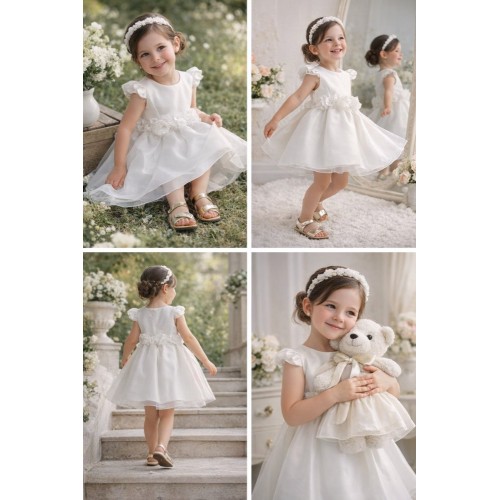 Rochia elegantă de ocazie Sarabanda pentru fete este alegerea perfectă pentru momente speciale precum nunți, botezuri, aniversări sau evenimente festive. Realizată din țesătură cu efect de organza și satin de mireasă, rochia impresionează prin rafinament și delicatețe. Fusta voluminoasă, îmbogățită cu inserții din tul fin, oferă un aspect diafan și elegant, iar căptușeala din bumbac asigură confort sporit pe durata purtării. Talia este pusă în valoare de o curea decorativă cu flori aplicate, care adaugă un plus de feminitate și stil. Sistemul de închidere cu fermoar invizibil la spate permite o îmbrăcare ușoară și un finisaj estetic curat.