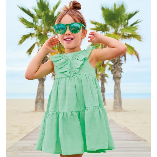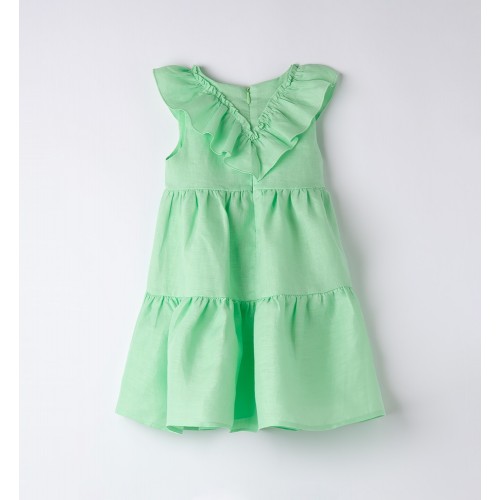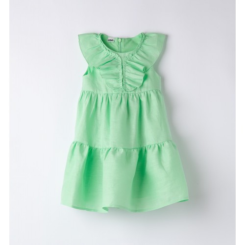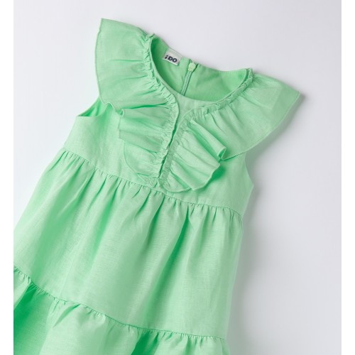Rochia iDO pentru fetiță este realizată din in, un material natural, ușor și respirabil, perfect pentru zilele călduroase de vară. Modelul este fără mâneci, cu volănașe delicate în partea superioară, care adaugă un plus de feminitate și eleganță ținutei.