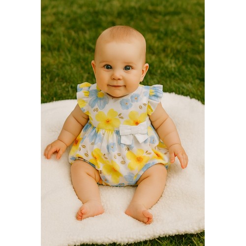 Salopeta iDO pentru bebelușă este realizată din poplin 100% bumbac, un material ușor și respirabil, ideal pentru pielea sensibilă a copiilor cu vârsta între 0 și 18 luni. Modelul are un imprimeu floral all-over în nuanțe de galben și albastru pe fond alb, oferind un look vesel și luminos, perfect pentru vară.