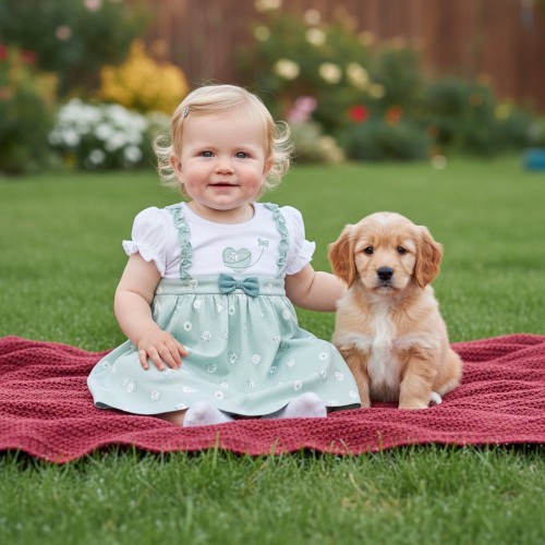 Salopeta tip rochiță I Do pentru fetițe este realizată din jerseu de bumbac elastic, moale și plăcut la atingere, ideal pentru pielea sensibilă a celor mici. Partea superioară albă, cu volănașe pe bretele și detalii delicate, se îmbină armonios cu fustița verde mentă, decorată cu imprimeu allover cu motive florale și inimioare.