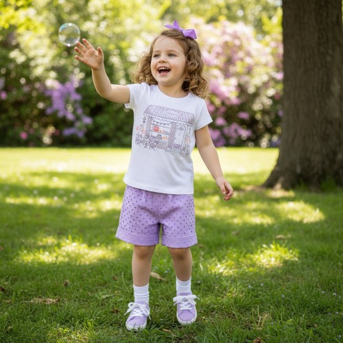Pantalonii scurți, realizați din bumbac moale și respirabil, au talie elastică și croială lejeră, oferind libertate de mișcare la joacă, plimbări sau în vacanță. Textura brodată cu perforații și tivul rulat conferă un aspect modern și feminin. Compleul este disponibil în două variante de culori vibrante – portocaliu și mov – astfel încât să poți alege combinația preferată pentru micuța ta. Materialul de calitate superioară asigură confort pe durata întregii zile și rezistență la purtări și spălări repetate.