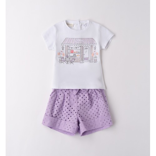 Compleul de vară pentru fete Sarabanda este alegerea ideală pentru un look lejer, confortabil și plin de stil. Setul este alcătuit dintr-un tricou din jerseu de bumbac elastic, cu închidere la spate cu nasturi, decorat frontal cu un imprimeu delicat tip patiserie, care adaugă un strop de veselie ținutelor de zi cu zi.