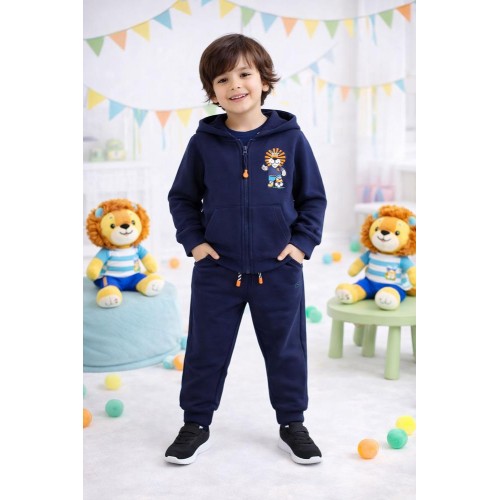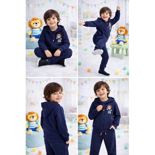 Treningul pentru băieți Sarabanda este un compleu practic și versatil, potrivit pentru purtare zilnică. Setul este format din hanorac și pantaloni, confecționate din bumbac moale, care oferă confort pe tot parcursul zilei. Hanoracul se închide cu fermoar, dispune de buzunare tip cangur și are un design uni, completat de un imprimeu decorativ discret. Pantalonii sunt prevăzuți cu talie elastică și șnur ton pe ton pentru o ajustare ușoară, iar manșetele elastice din partea de jos asigură o fixare comodă. Designul simplu și culoarea bleumarin îl fac ușor de asortat cu alte articole vestimentare.