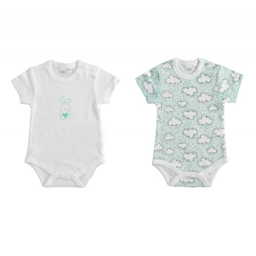 Primul body este alb, cu imprimeu central cu iepuraș și inimioară în nuanță de verde mentă, pentru un look simplu și delicat. Al doilea body are fundal verde mentă cu imprimeu allover cu iepurași albi și mici detalii punctate, pentru un aspect jucăuș.