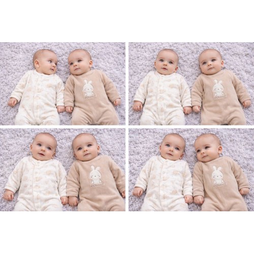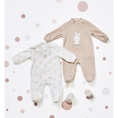 Setul include două modele diferite: o salopetă cu sistem de închidere frontal și una cu deschidere la spate, ambele prevăzute cu capse practice pentru o îmbrăcare rapidă și ușoară. Designul delicat și materialele atent alese asigură o senzație plăcută pe pielea sensibilă a bebelușului.