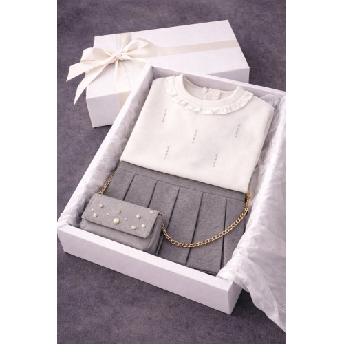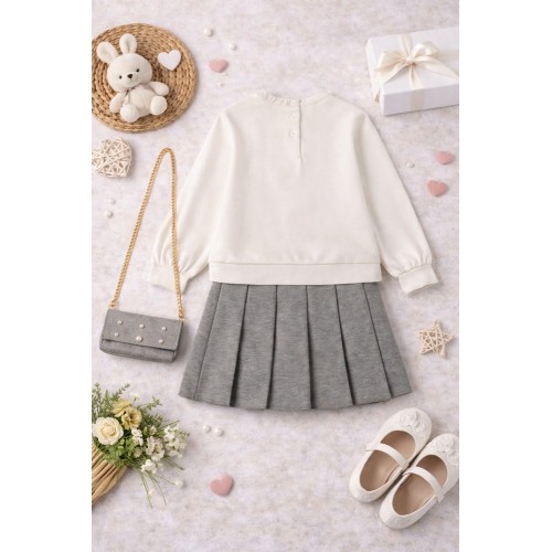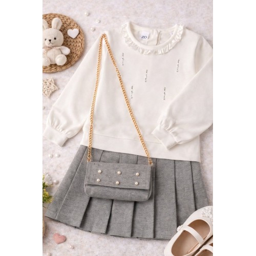 Fusta este confecționată din material punto Milano, are croială plisată și lungime deasupra genunchiului, oferind un aspect clasic și rafinat, dar și libertate de mișcare. Setul este completat de o geantă de umăr asortată, cu bretea detașabilă, decorată cu perle și rhinestones, perfectă pentru accesorizarea ținutei. Dimensiuni aproximative ale genții: înălțime 9 cm, lungime 16 cm.
