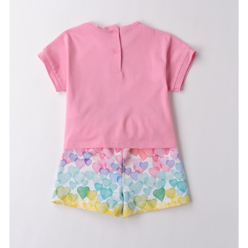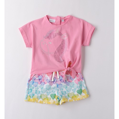 Tricoul roz este realizat din bumbac stretch, cu croială lejeră și nod decorativ la baza frontului, detaliu care adaugă un plus de stil modern. Imprimeul cu unicorn și accente glitter oferă un efect strălucitor, îndrăgit de cele mici. Pantalonii scurți sunt confecționați din fleece ușor, cu imprimeu all-over cu inimi colorate în nuanțe pastel și vii, pentru un aspect jucăuș și plin de energie.