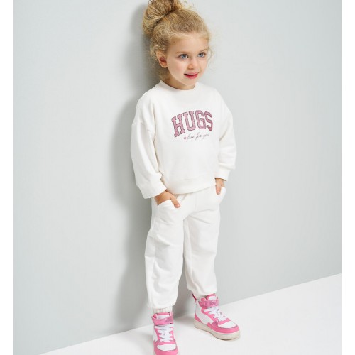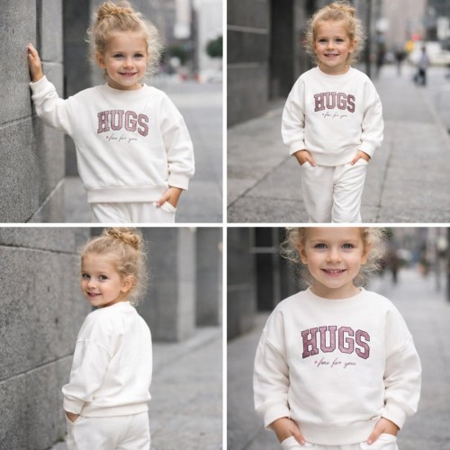 Hanoracul și pantalonii sunt confecționați din bumbac elastic, asigurând libertate de mișcare și o potrivire confortabilă. Tricoul este realizat din jerseu de bumbac 100%, respirabil și delicat cu pielea copiilor. Designul modern este îmbogățit cu imprimeu decorativ, elemente cu glitter și strasuri, adăugând un plus de atractivitate ținutei.