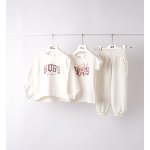 Treningul pentru fete iDO este conceput pentru confort și stil în sezonul de tranziție, fiind realizat din fleece de toamnă neperiat, moale și plăcut la purtare. Setul este format din hanorac, pantaloni lungi și tricou cu mânecă scurtă, oferind o ținută completă și practică pentru activitățile zilnice.