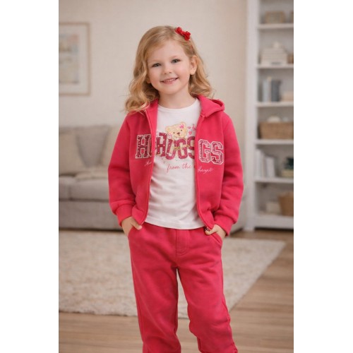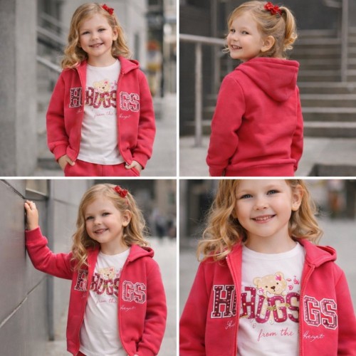 Hanoracul și pantalonii sunt confecționați din bumbac elastic, asigurând libertate de mișcare și o potrivire confortabilă. Tricoul este realizat din jerseu de bumbac 100%, respirabil și delicat cu pielea copiilor. Designul modern este îmbogățit cu imprimeu decorativ, elemente cu glitter și strasuri, adăugând un plus de atractivitate ținutei.