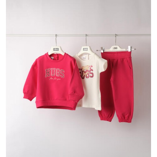Treningul pentru fete iDO este conceput pentru confort și stil în sezonul de tranziție, fiind realizat din fleece de toamnă neperiat, moale și plăcut la purtare. Setul este format din hanorac, pantaloni lungi și tricou cu mânecă scurtă, oferind o ținută completă și practică pentru activitățile zilnice.