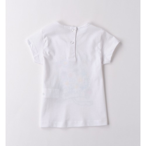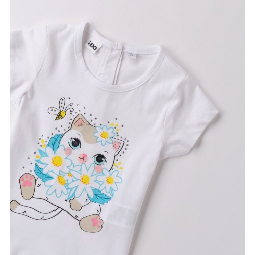 Tricou iDO pentru fete, realizat din jerseu moale 100% bumbac, oferind confort și libertate de mișcare în zilele călduroase. Modelul are croială clasică, închidere la spate cu nasturi și imprimeu adorabil cu pisicuță și flori albastre. Perfect pentru joacă, plimbări sau ținute casual de vară.